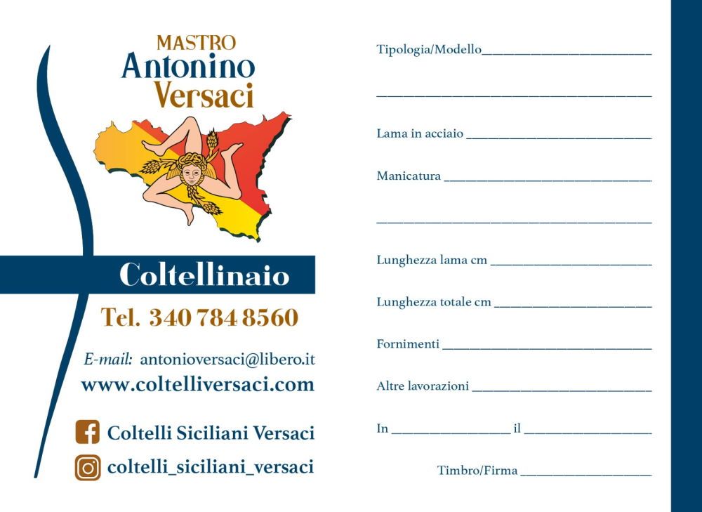 Mi chiamo Antonino Versaci, sono nato a Messina il 20 gennaio 1986 e sono originario di San Fratello (ME). La mia storia ha inizio quando da piccolissimo, nell’officina di mio padre (fabbro), curiosando tra i vari cassetti, trovai un coltello “Sanfratellano” in fase di realizzazione e da quel giorno il mio unico desiderio fu quello di poterlo ultimare da me. Ho ancora davanti agli occhi quel bambino accanto al nonno (anch’egli fabbro, ma in pensione), tutto eccitato dal fatto di finire il coltello, anche se non aveva la più pallida idea di come fare e ricordo ancora, come fosse oggi, mio nonno che con tantissima pazienza seguiva e correggeva i disastri del suo nipotino, tutto sporco, ma felicissimo di imparare...
